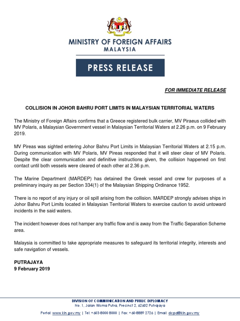 20190209 Press Release Collision In Johor Bahru Port Limits